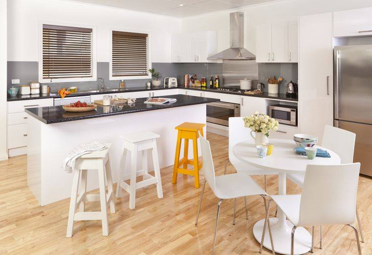 Sample kitchen colour scheme - we're having the black granite benchtops, white cupboards, stainless steel fittings, a white subway tile splash back and light grey ceramic square tiles on the floor.